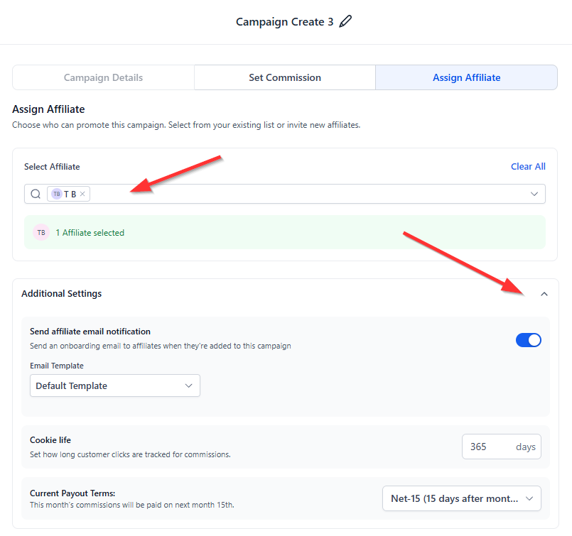 - Assign affiliates to participate in this campaign by typing them in the text box shown below. (You can add them later if they are not ready yet.)