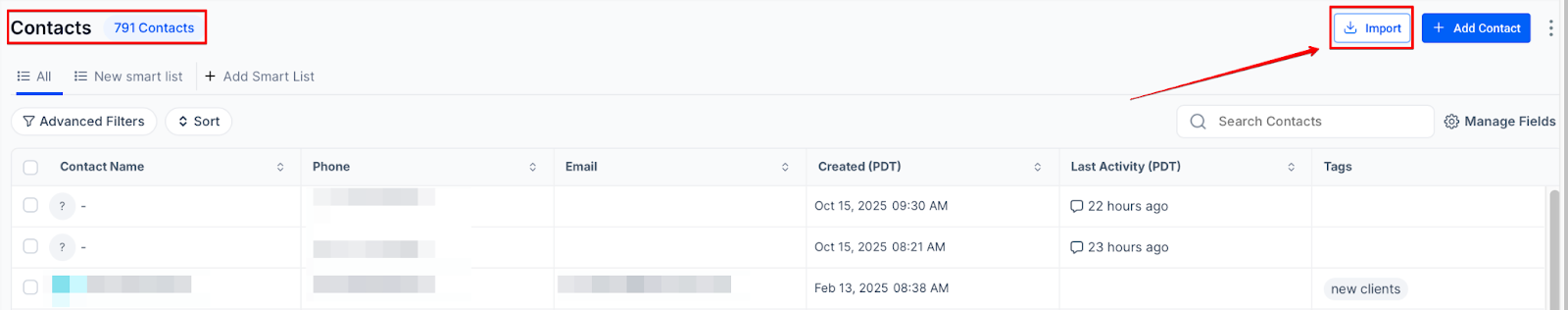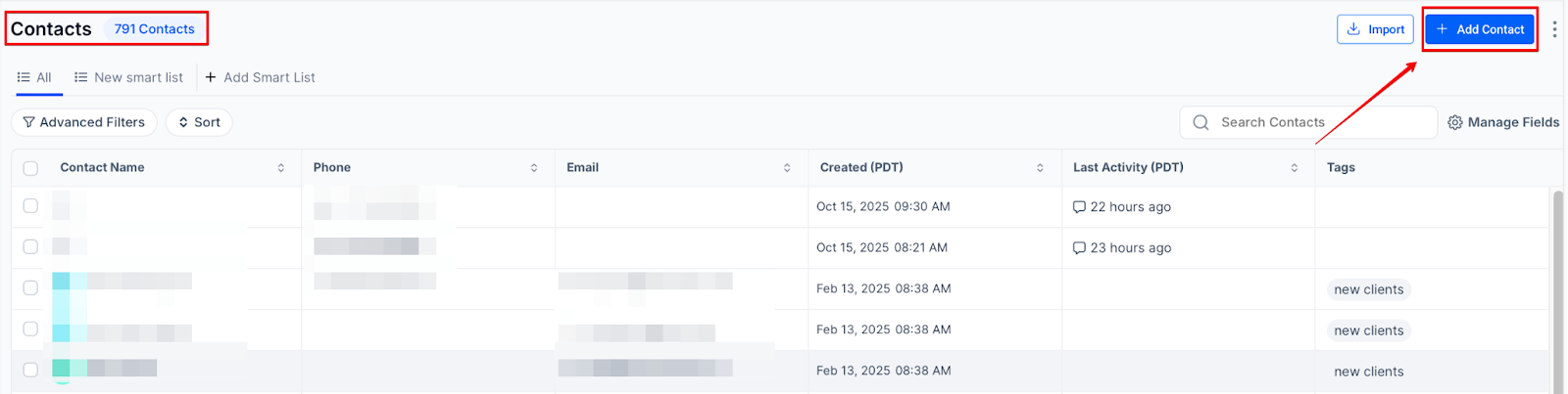 The Contacts tab is one of the most essential features in managing leads and client data effectively. This section helps you organize, manage, and utilize contacts with ease, making it a crucial tool for keeping track of your communication and interactions with clients. This article will cover how to efficiently manage contacts, add new ones, and use features like smart lists, bulk actions, and custom fields to streamline your workflow and enhance your marketing campaigns.