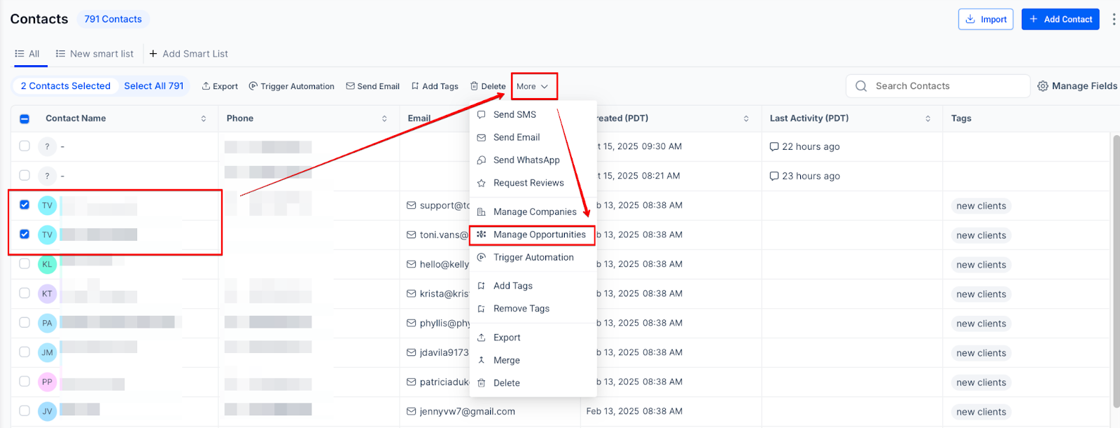 2. Use Opportunities/Pipeline Changes: If you need to move a contact to a different pipeline, just select the contact, choose the new pipeline, and move it.