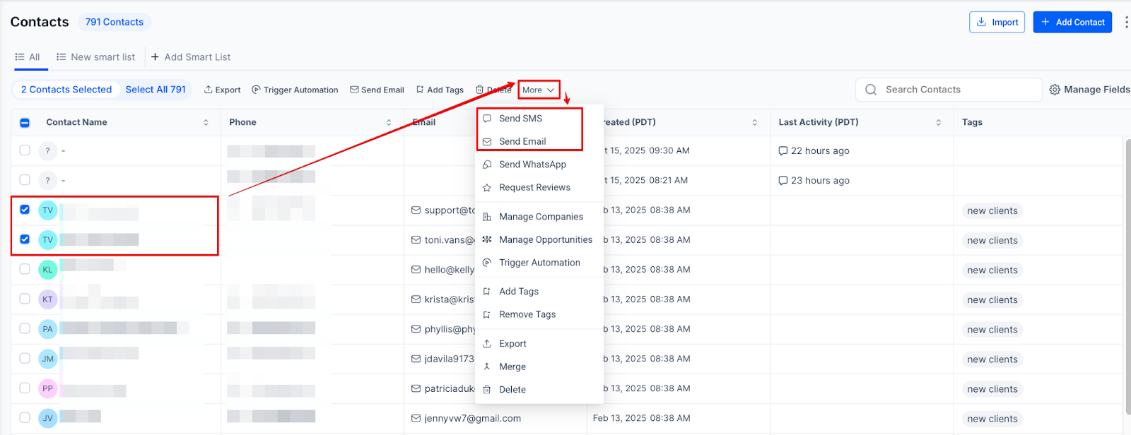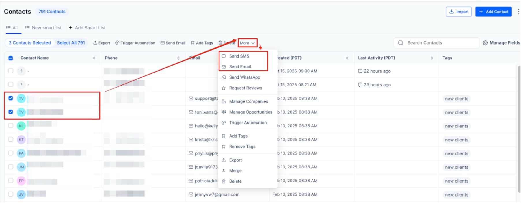 3. Send SMS/Emails: Select multiple contacts, then click on the "Send SMS" or "Send Email" option to quickly communicate with your audience.