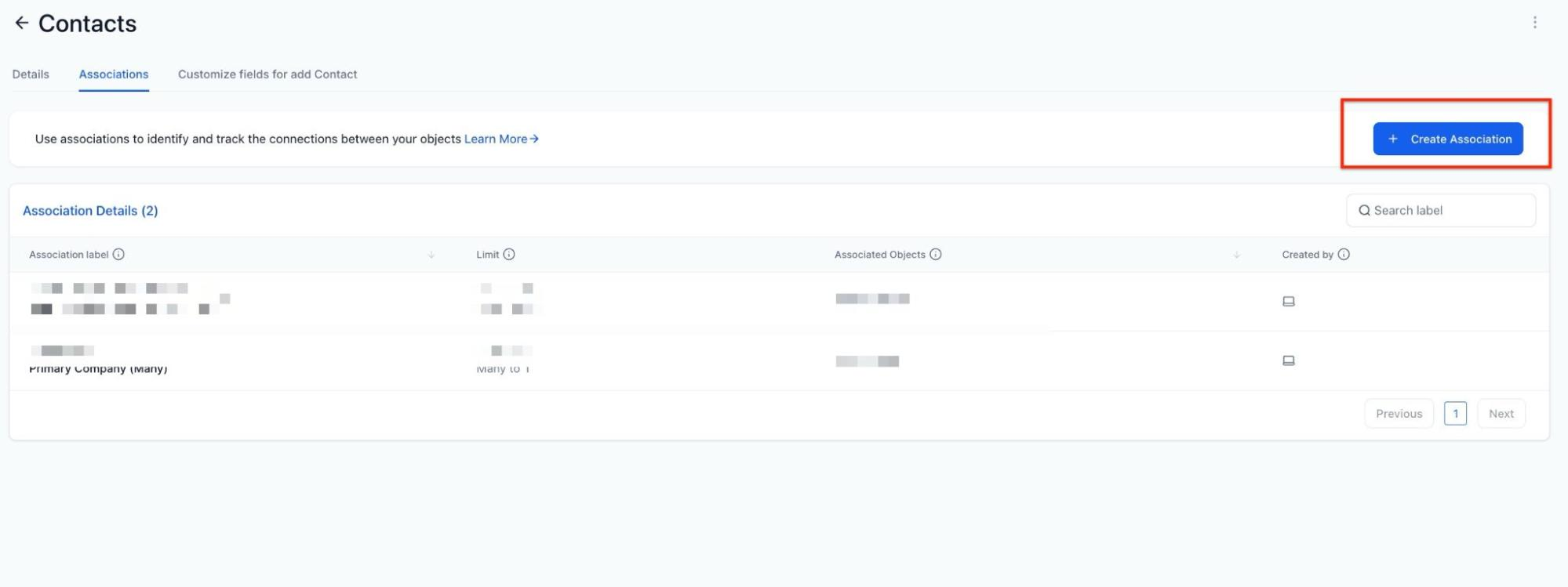 - Navigate to Settings(Located in the bottom left corner) > Objects > Contacts and click on + Create Association.