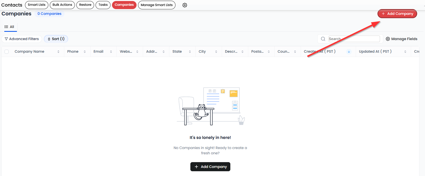 Step 1: Navigate to the Contacts tab, and select the Companies feature at the top.