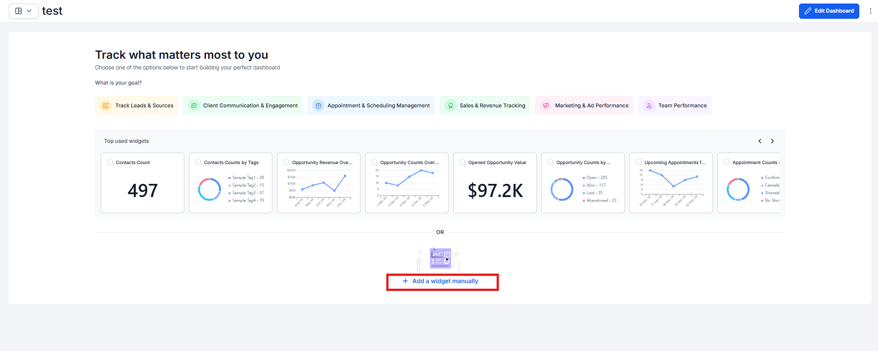 - Add Widgets: Click on the “create new dashboard” option if you want a new setup, or locate the “edit” or “add widget” icon to customize an existing dashboard.