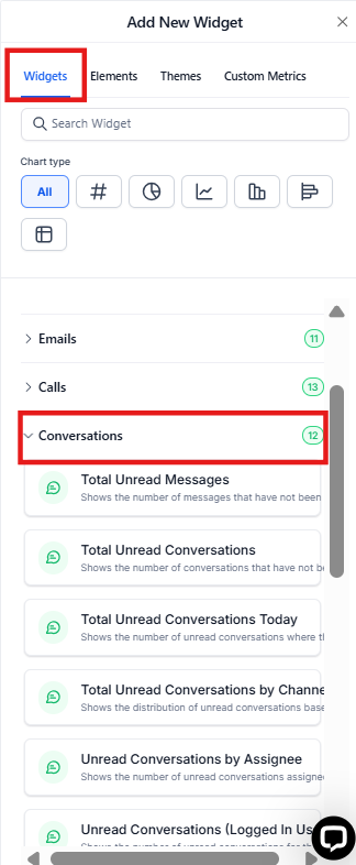 Scroll through the available conversation widgets. Select those that align with your business needs and add them to your dashboard.