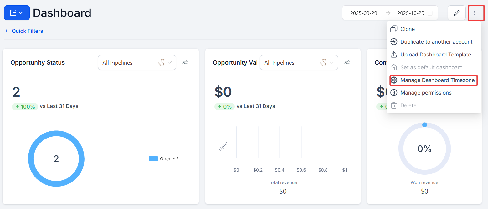 - Navigate to Timezone Settings: Click on the 3-dot menu on your dashboard interface.