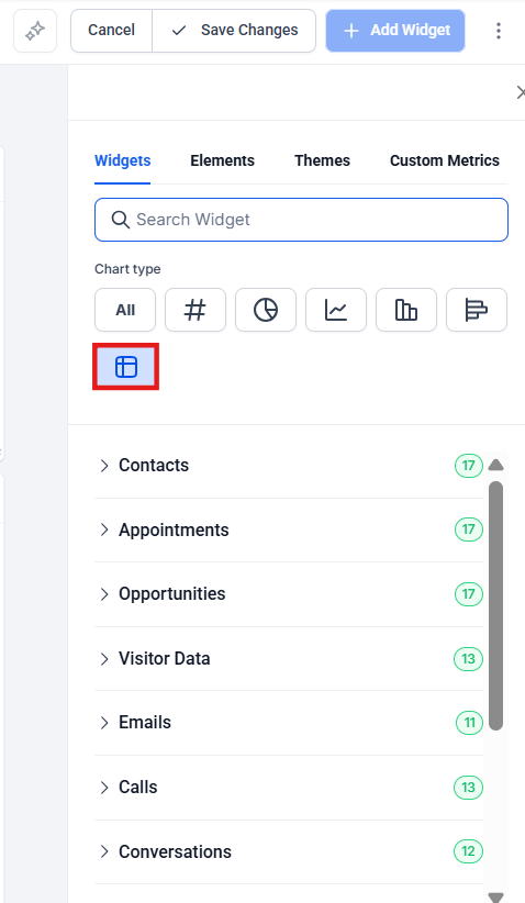 Step 2: Add a widget and choose the table chart type.
