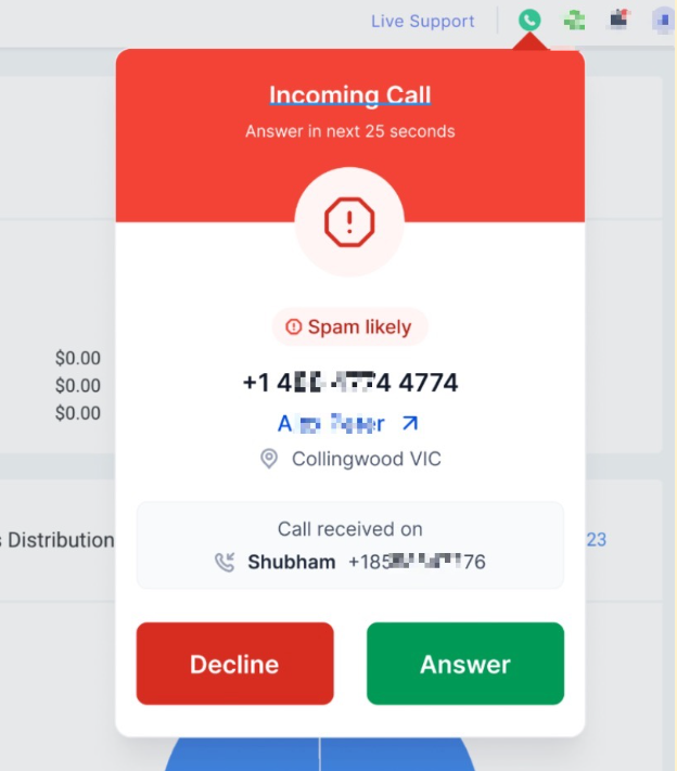 Answer: Incoming calls flagged by the system will be clearly labeled as "Spam Likely" on the web dialer. Additionally, these calls will be tagged in your Contacts tab for better transparency and record-keeping.