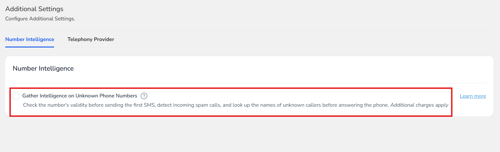 - Navigate to Account Settings (located on the bottom left corner of your screen) > Phone System > Additional Settings > Number Intelligence.