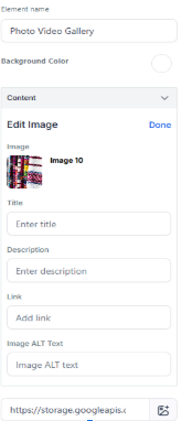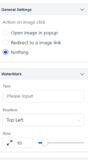 - Image Info & Actions: Add captions and descriptions to images. Choose click actions like opening in lightbox or redirecting to a URL. Use watermarks for added branding and protection.