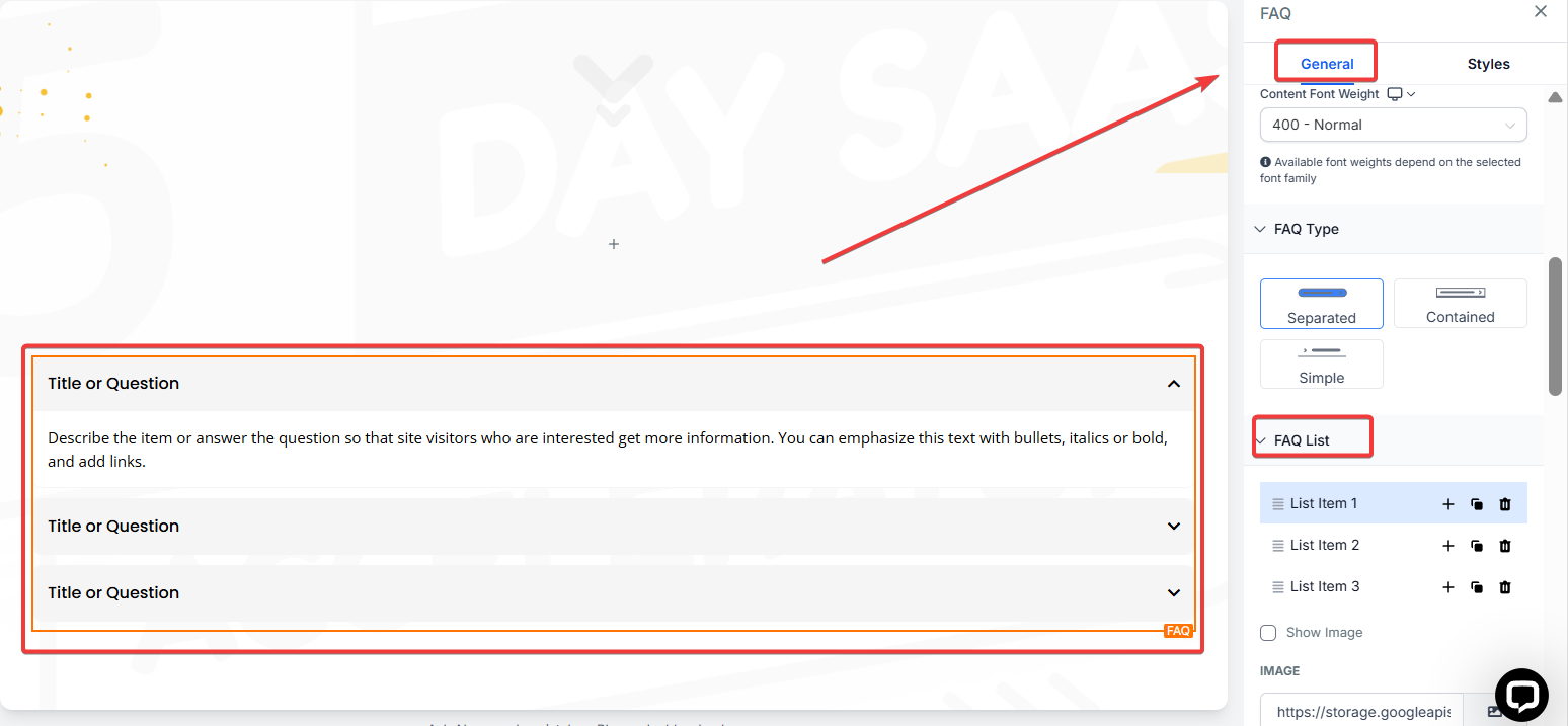 - For an FAQ Element: Click on the FAQ, and in the settings, add each FAQ as a separate item. Enter the question in the title field and the answer in the content field.