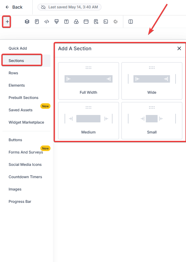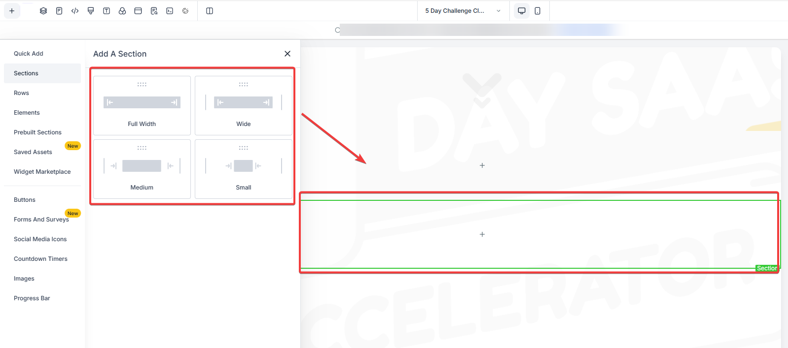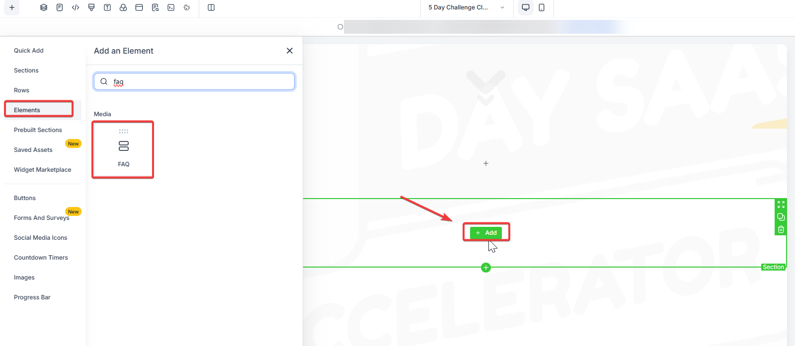2- Add a New Section: Click on the + Add Section button to create a new section in your funnel or website. This is where you’ll place your FAQ. Drag and drop the desired section to the suitable location.