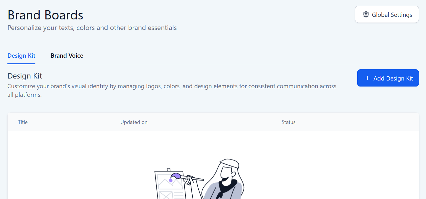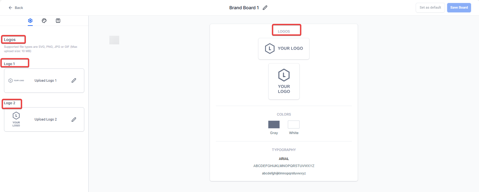 - Media Library: Logos uploaded to the brand board will be stored in your media library, categorized by board name, making them easy to access for future projects.