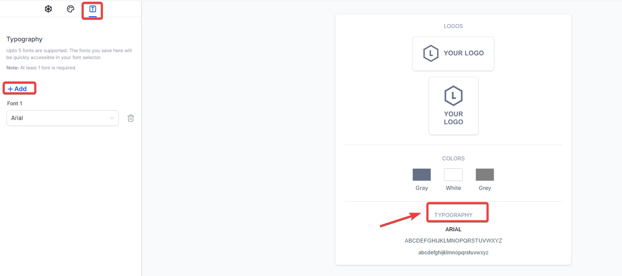 - Navigate to the Typography Section and click Add to choose your brand’s fonts.