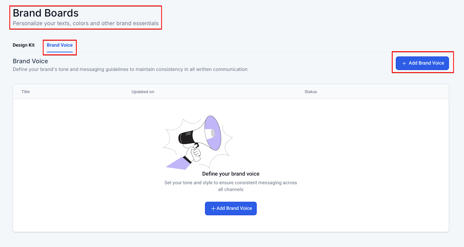 The Brand Voice feature in Brand Boards allows you to define your unique communication style, including your business values, tone, and voice. This helps customize your experience across the platform and powers up AI tools to reflect your brand's identity in all content.
