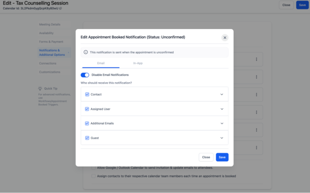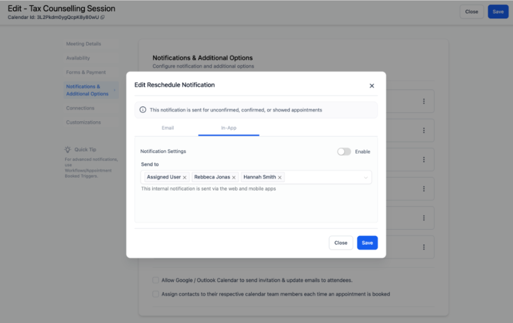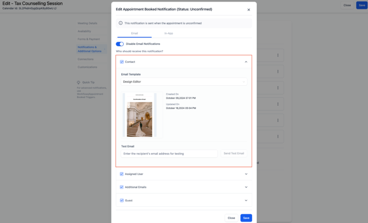 Users can fully customize their email and in-app notifications related to appointments. This allows users more control over notification content and recipients, with six types of notifications available, including Appointment Booked, Cancellation, and Follow-Up.