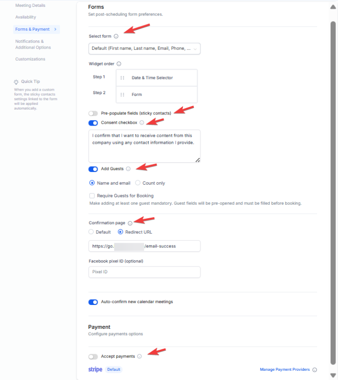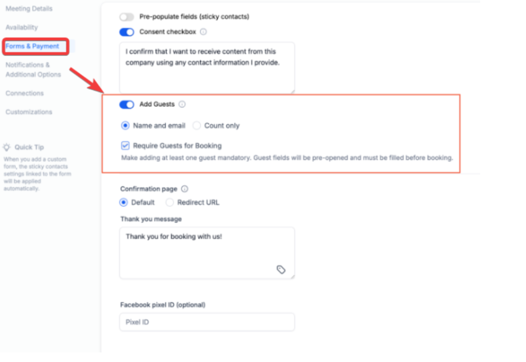 This streamlines guest handling in appointment bookings, allowing automatic payment calculation based on total attendees—perfect for per-person services. A key benefit is simplified group scheduling with accurate charges. To enable it, go to Calendar Settings → Edit Calendar → Forms & Payment tab. Turn on Require Guests for Booking and Collect payment for all attendees.