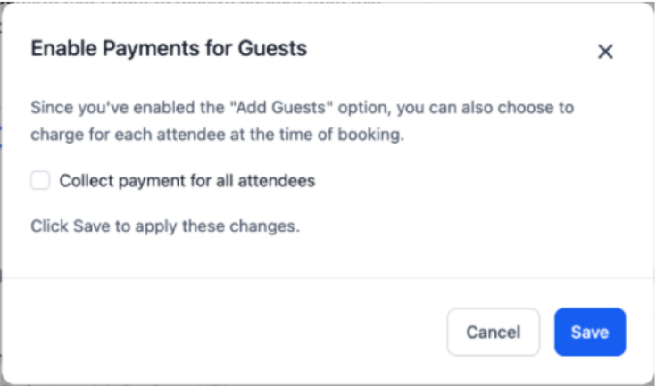 - Enable the Collect Payment for all attendees option to charge based on the total number of guests. The payment amount will be multiplied by the total number of attendees, and the booker will be charged accordingly via the booking widget.