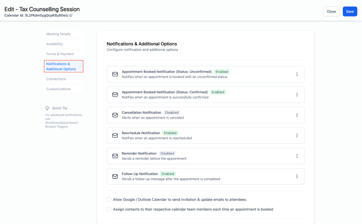 You can customize the calendar URL under Calendar Settings, ensuring a branded and user-friendly scheduling experience. The URL must be available before saving.