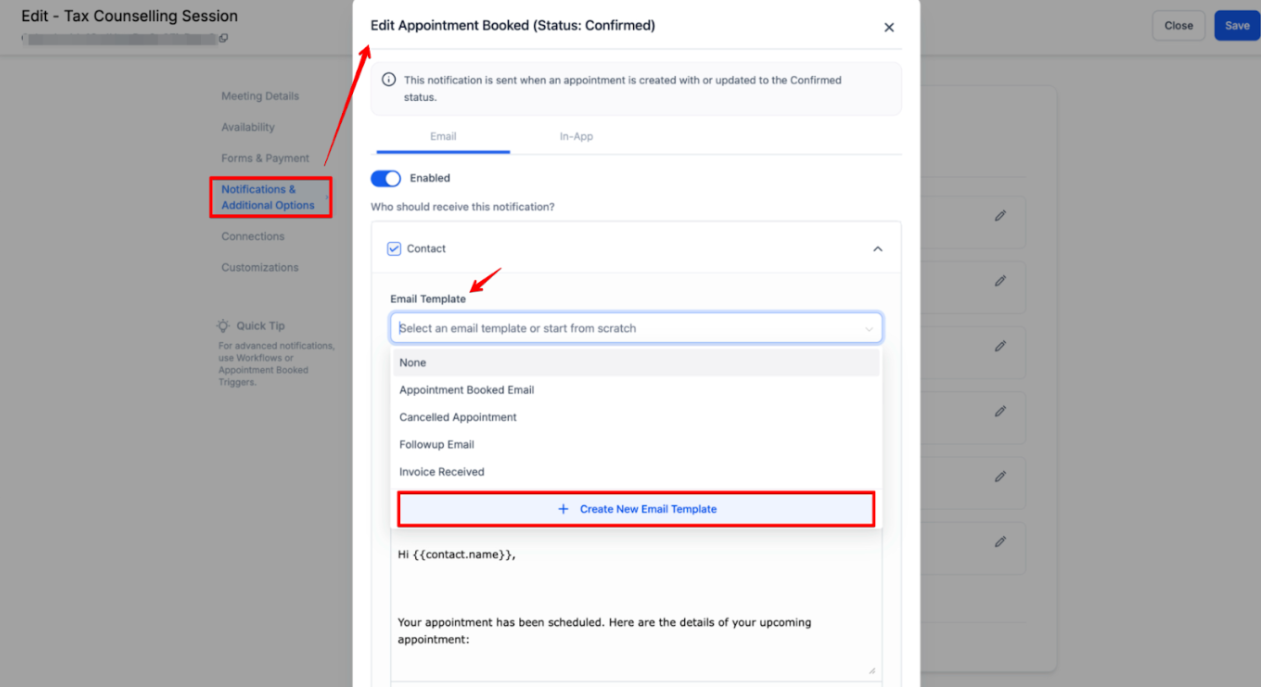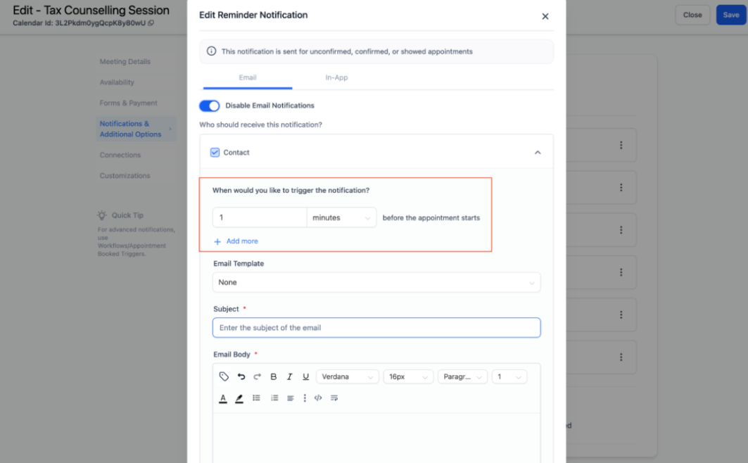 - You can select an existing email template or create a new one with a custom subject line and message body. You can create email templates directly from within the calendar notification settings, no need to switch back and forth between different sections.