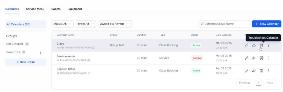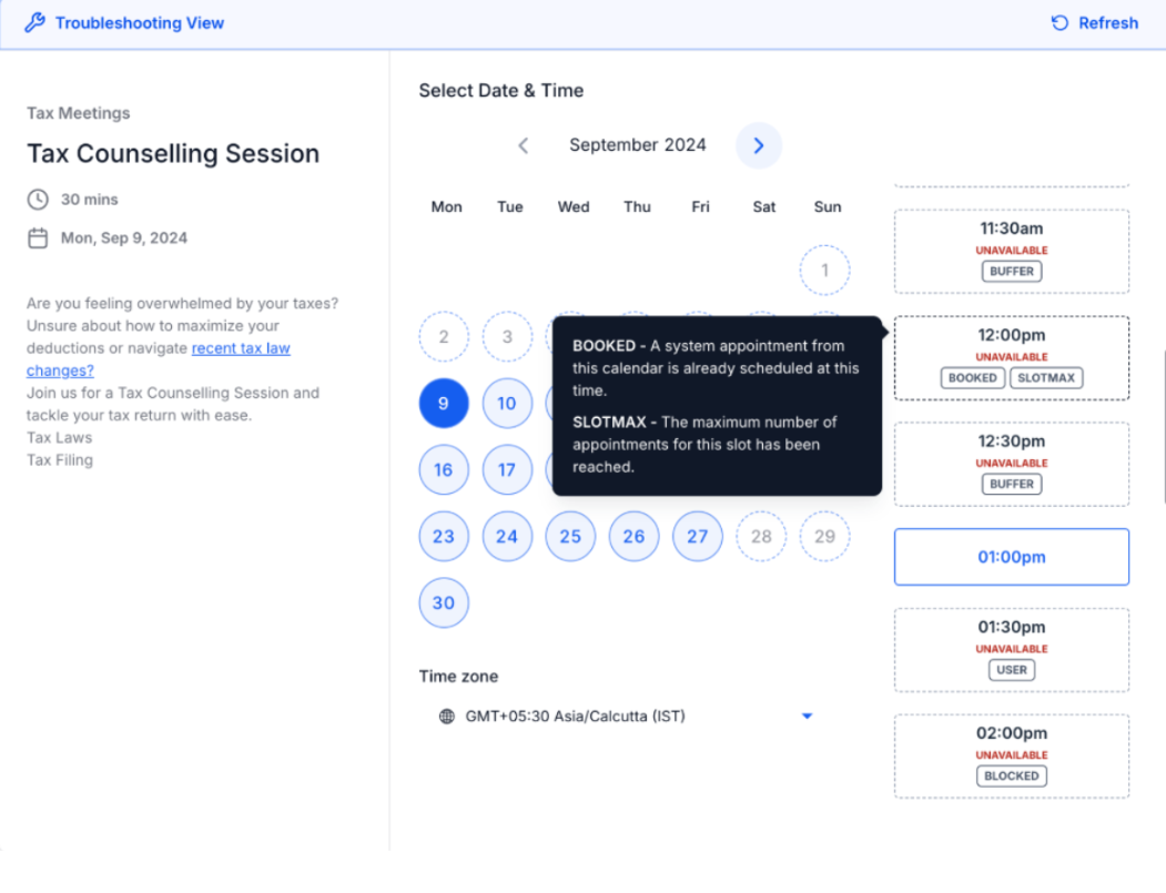 To use, simply go to Calendar Settings, click on the "Troubleshoot Calendar" option to view available and unavailable slots along with explanations.
