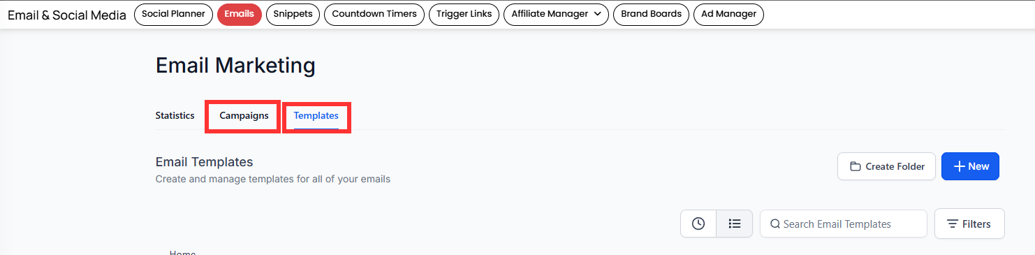 To navigate to the Builder, click on Marketing & Sales > Email & Social Media on the left > Emails on the top and select Campaigns/Templates.