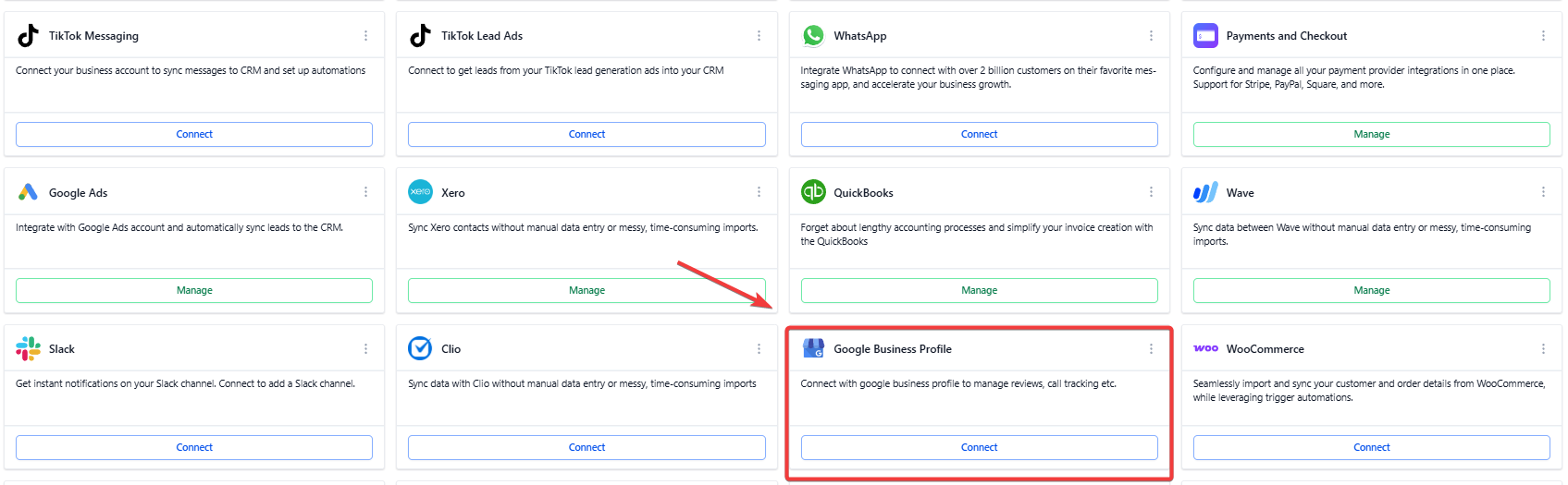 - Find the Google Business Profile integration option and select 'Connect'.Ensure your Google account is connected.