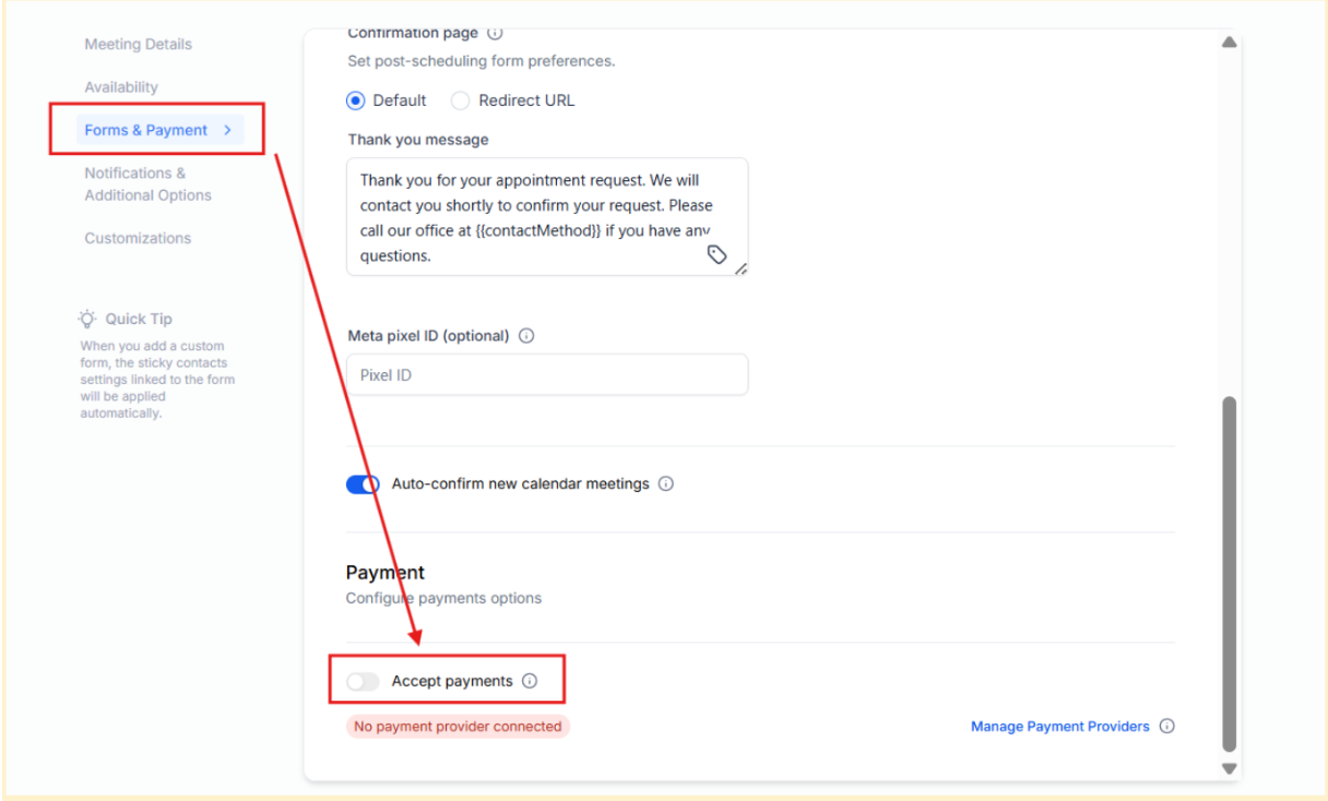 - Integrating payments is just as simple for those using calendars. Go to Your Customers > Calendars > Calendars Settings > Edit an existing calendar or create a new one, and under 'Forms & Payments,' you'll find a toggle to "Accept Payments."