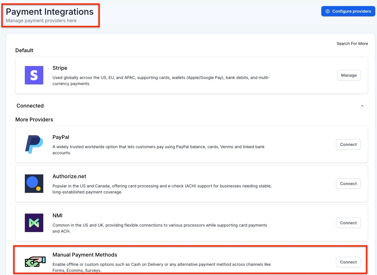 - Disconnect Default Providers: Navigate to Payments > Integrations and disconnect the default online payment providers to enable the use of manual payment methods exclusively.