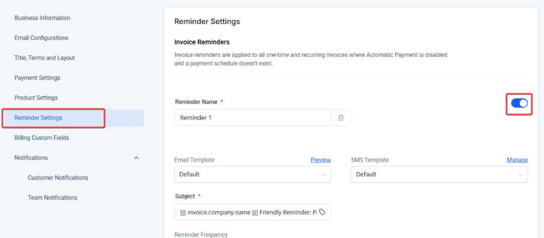 - Turn On Reminders: Use the toggle to enable invoice reminders.