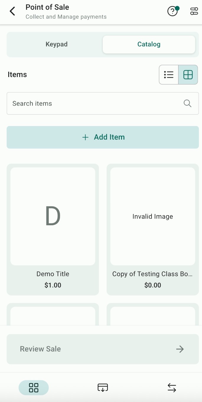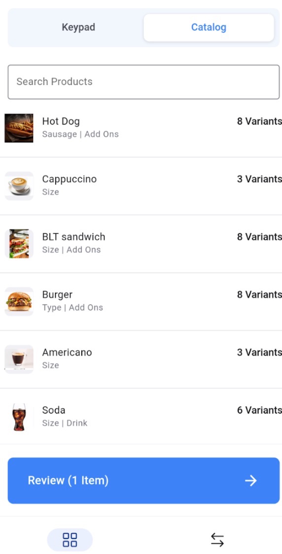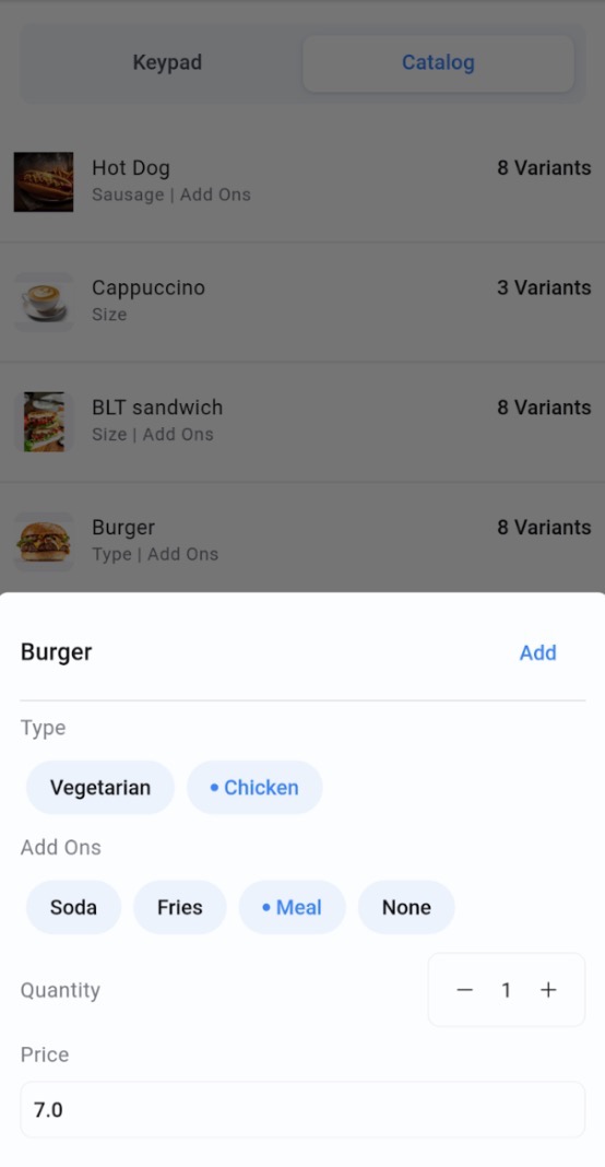 - Cohesion with Keypad: Use the existing keypad screen to add custom items alongside catalog items.