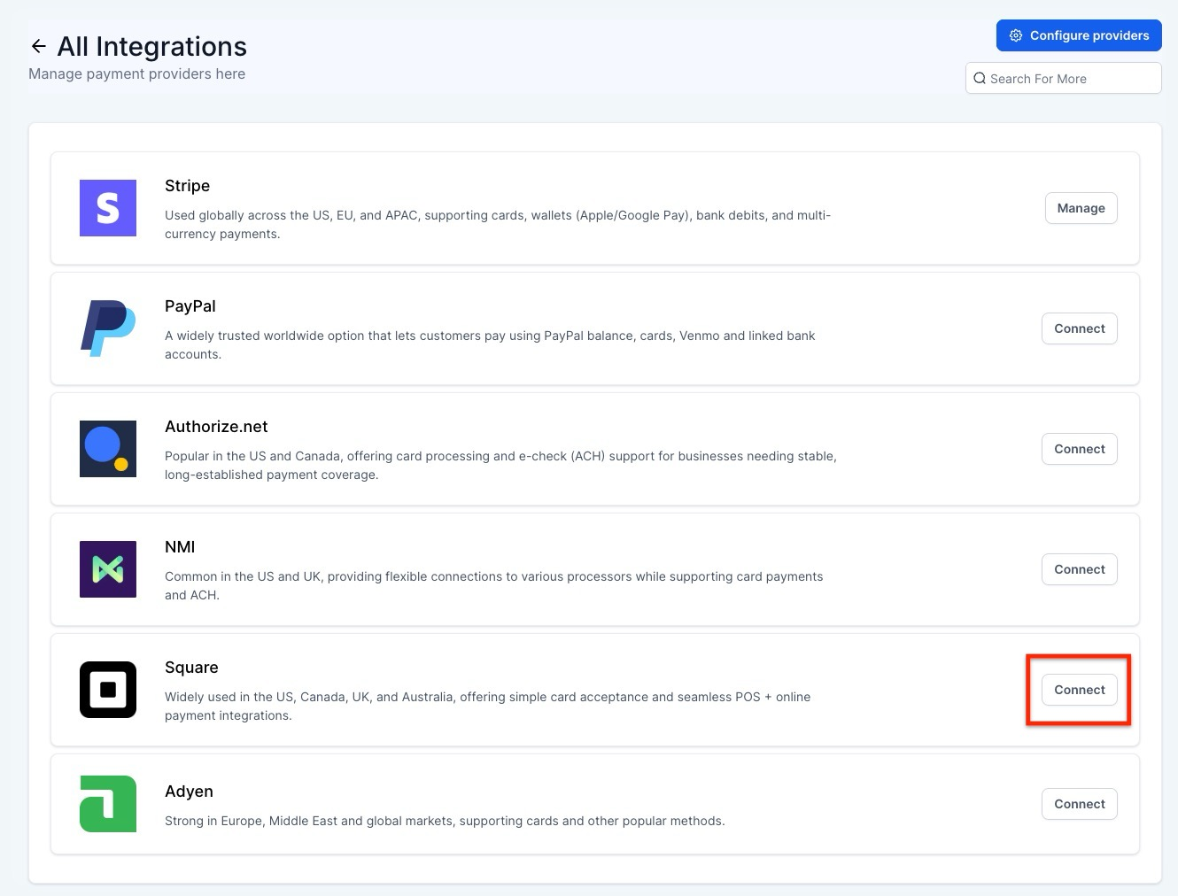 The Integration of Square allows businesses to connect their Square accounts directly, offering a seamless and efficient way to manage transactions, whether they are one-time payments or recurring subscriptions.