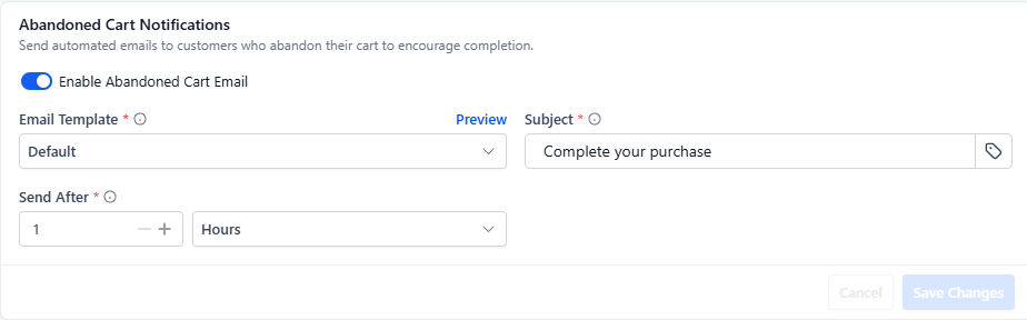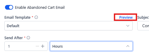 - Enable/Disable Toggle: The toggle functionality allows users to easily turn on or off abandoned cart emails with just a click. This provides users with clear control and ensures that it can be activated or deactivated without hassle.