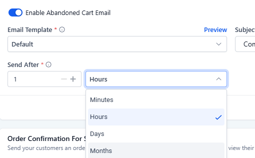 You have full flexibility to choose when to send the email. You can set it to send after minutes, hours, days, or months, depending on when you think your customers will be most likely to complete their purchase.