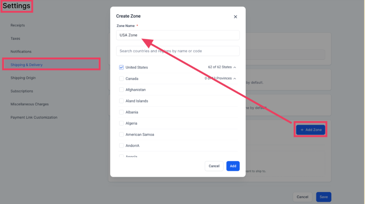 - Navigate to Payments > Settings > Shipping & Delivery > Add Zones > Add Rate.