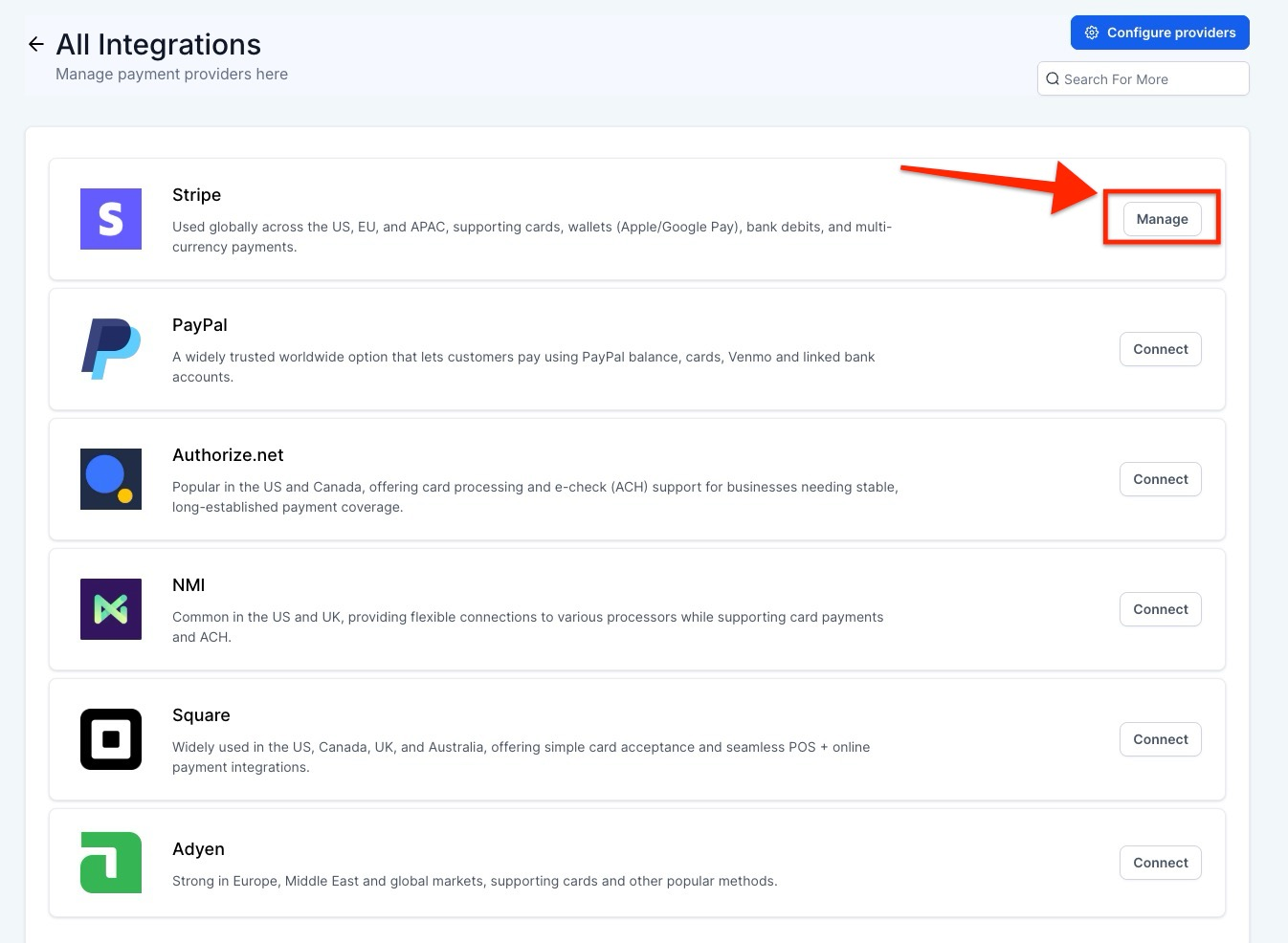 Go to Marketing & Sales > Payments on the left > Integrations at the top > Stripe > Manage Payment Methods