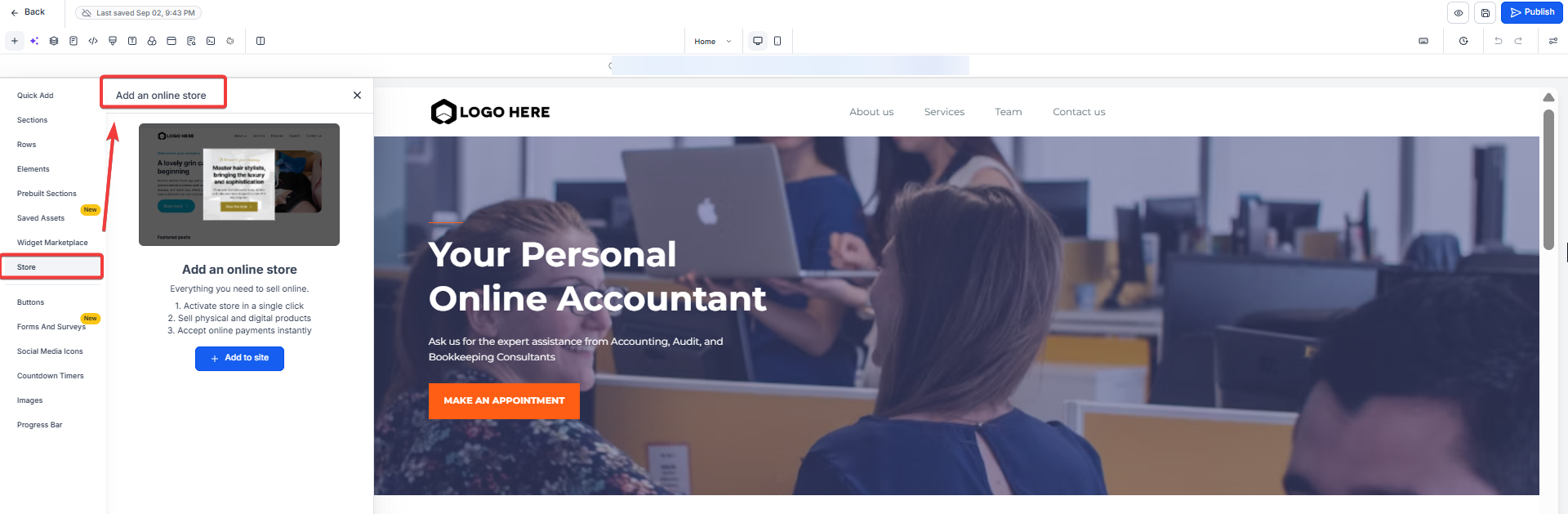 - Add a new element using the “+” button and click on the “Store” category to create your online store