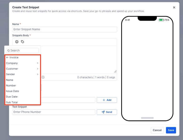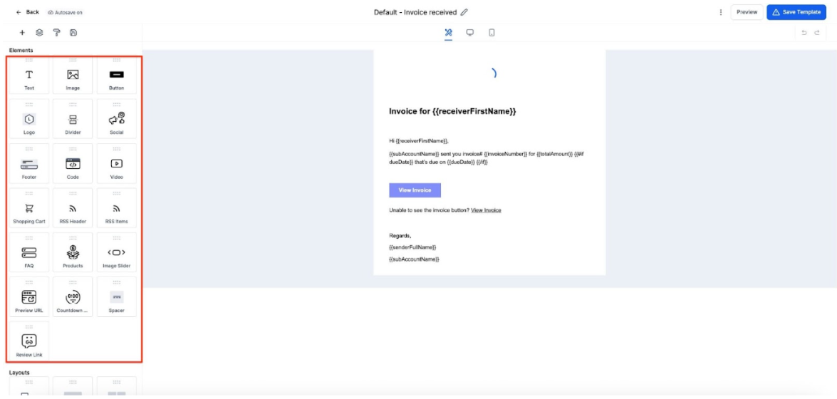 - Use the Invoice custom values in the Email and SMS Templates (Snippets in the Marketing tab) to include details in notifications like customer information, invoice total, due date, invoice URL, etc.