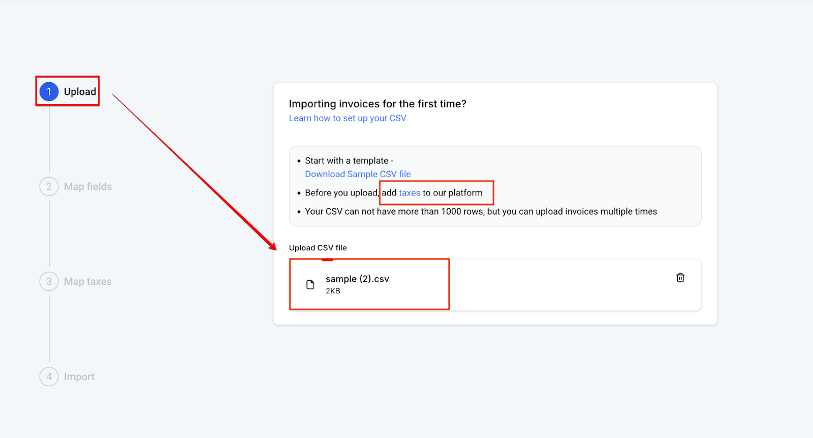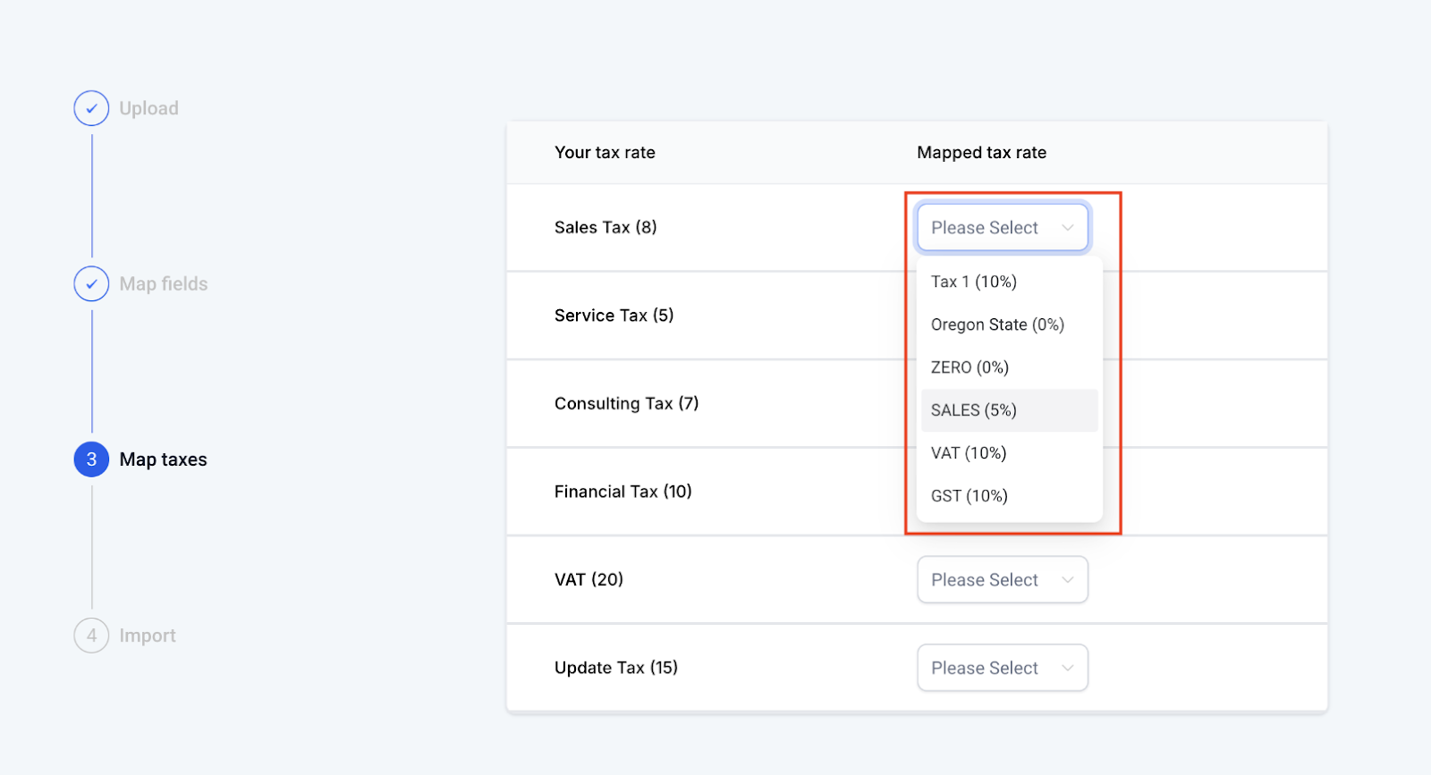 A: You will need to map the tax columns in your CSV to the tax rates already configured in the system. This ensures the correct tax information is applied.
