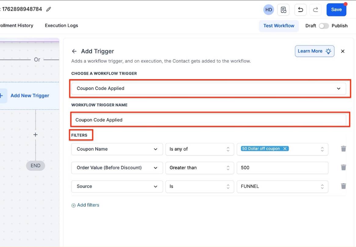 - For example, you can specify the coupon code, product type, or order value to fine-tune when the trigger is activated.