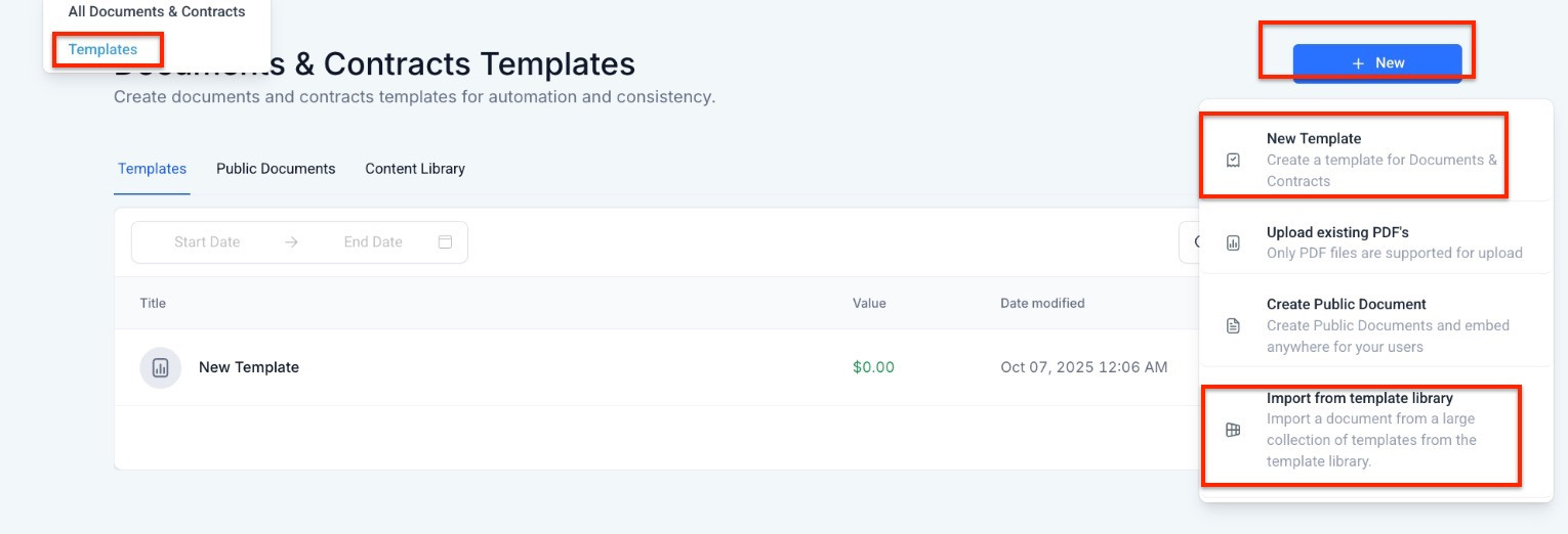 - Click on + New to add a New Document or Upload a PDF or Import from the template Library