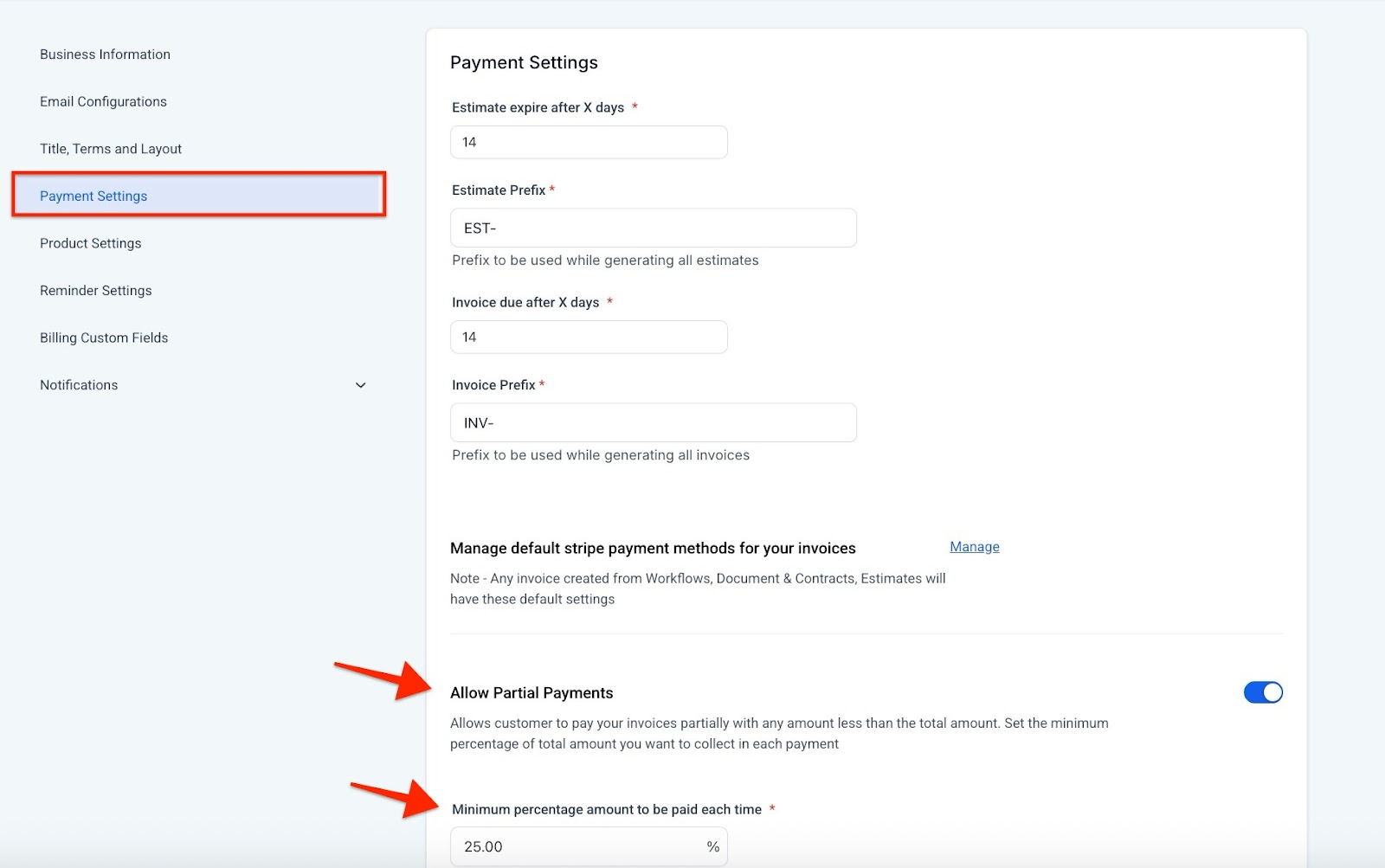 - Set the minimum percentage of the total invoice amount you will accept as a partial payment. This percentage represents the smallest fraction of the invoice the customer can pay.