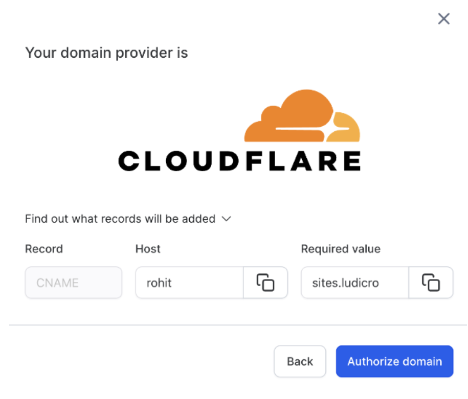 - Update your CNAME records to point to sites.ludicrious.cloud.