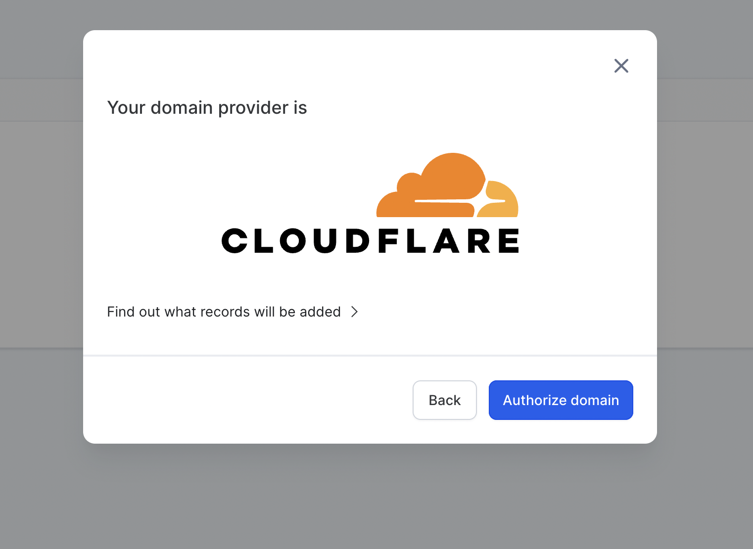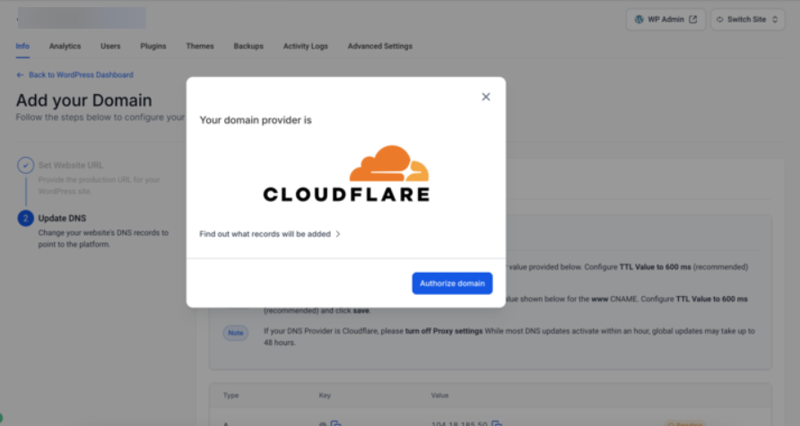 5- An "Authorize" button will display if your domain is registered with GoDaddy, or Cloudflare. Click it to initiate the DNS settings change.