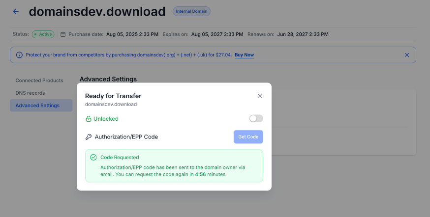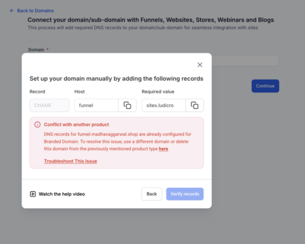 Domain Connect also prevents domain configuration conflicts between different product types. This ensures that if connecting a domain to a new product could disrupt an existing product's connection, the system will block the action and display a clear error message.