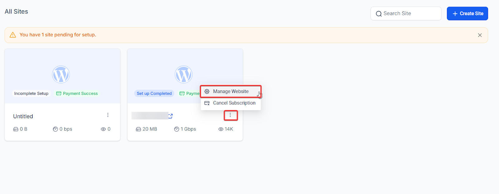 1- Go to the WordPress hosting section in your dashboard by going to Marketing & Sales > Funnels & Pages > WordPress.