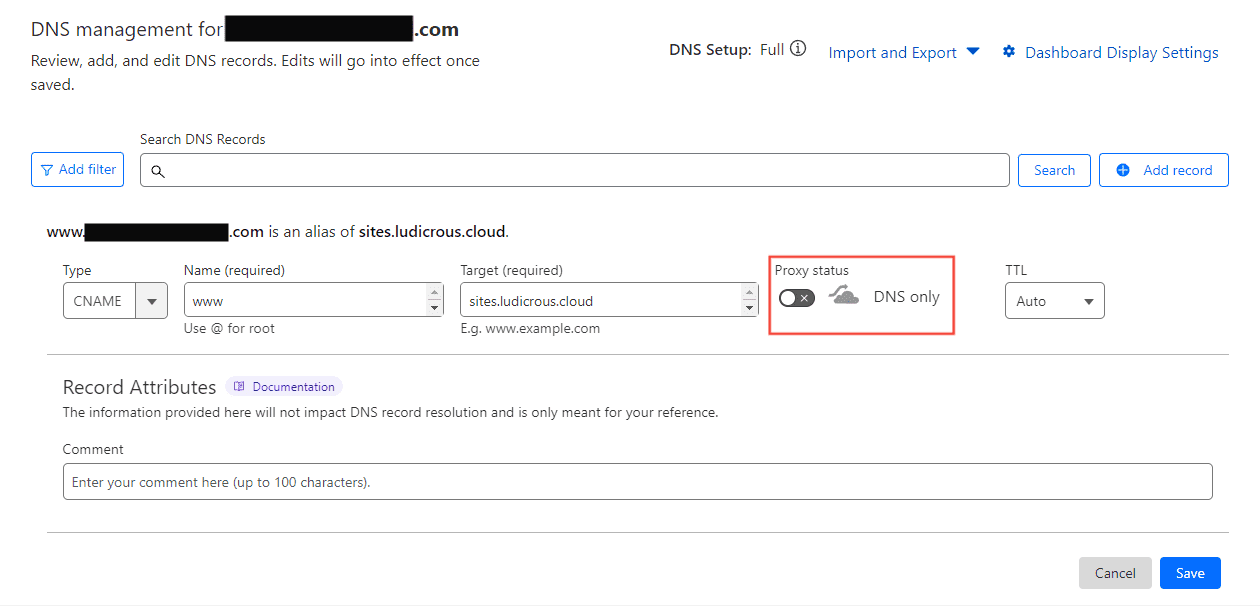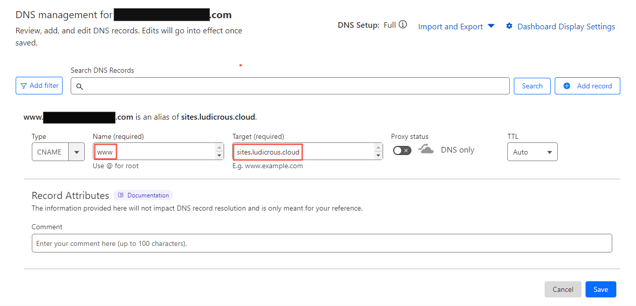 - (Recommended) Add a CNAME record for your root domain or any sub-domains with the value ‘sites.ludicrous.cloud’