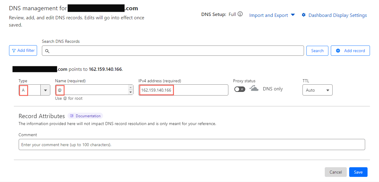 - (Alternative) Use an A name for your root domain, specifically pointing to 162.159.140.166
