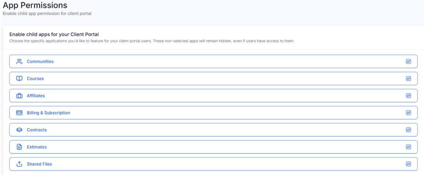 - Toggle Permissions: Use the toggle button next to each app to either enable or disable it. When disabled, the app and its related features will no longer appear on the client portal interface.
