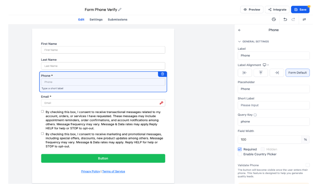 - SMS Verification Button: A “Verify Phone” button is displayed next to the phone number input field in forms and surveys.