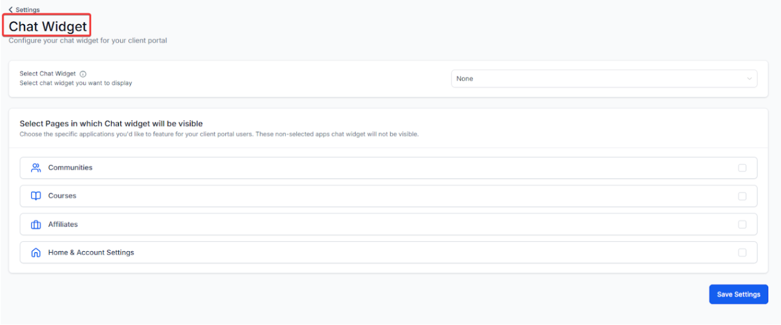 This allows you to integrate a Chat Widget into the Client Portal, including specific modules like Communities, Courses, and Affiliates, enabling real-time communication within the portal. By adding the Chat Widget to selected child apps, users can easily access support and interact without leaving the app. This setup improves user engagement and streamlines support workflows.